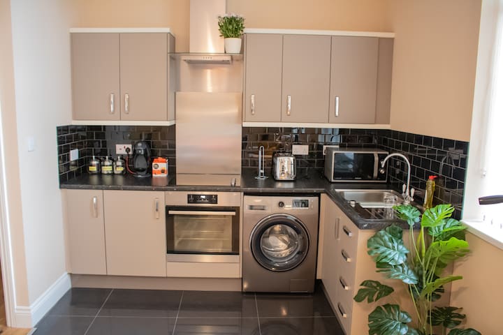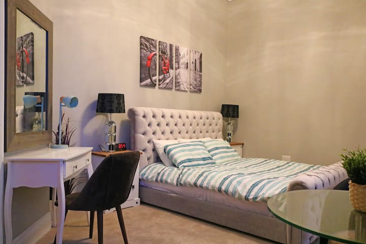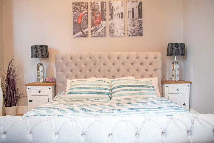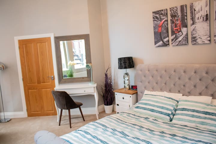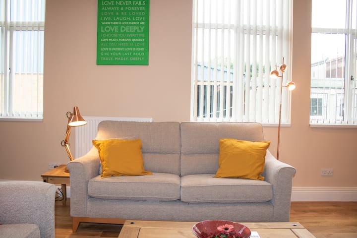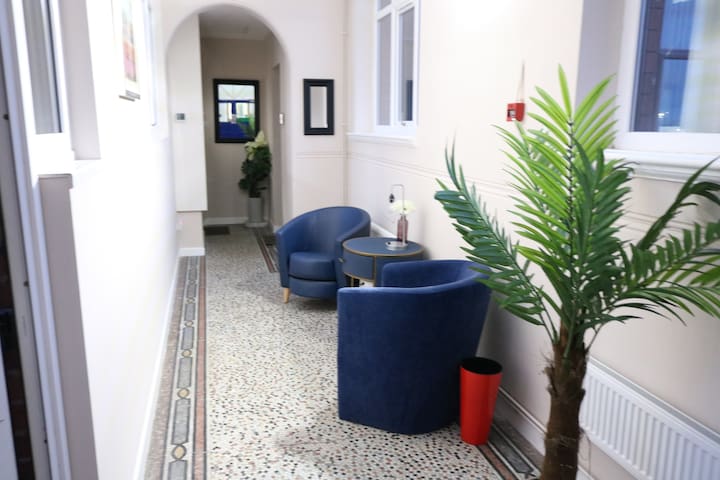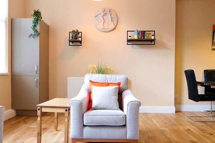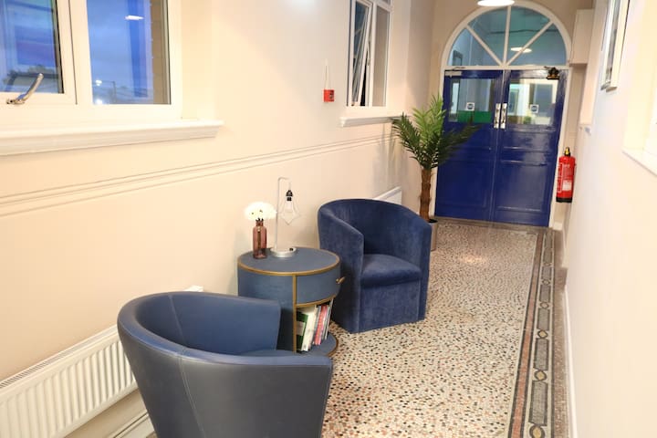 Enjoy the blend of elegant throwback style with a modern twist close to the heart of Sheffield. Discover a space full of soothing grey and creme tones, opulent furnishings and decor, and a feel of the historic steel city from within the iconic building. Delve into some literature and then fall asleep in a heavenly bedroom with a massive king bed within its grey-painted walls and twinkling lights. And when you wake up, the coffee machine awaits.