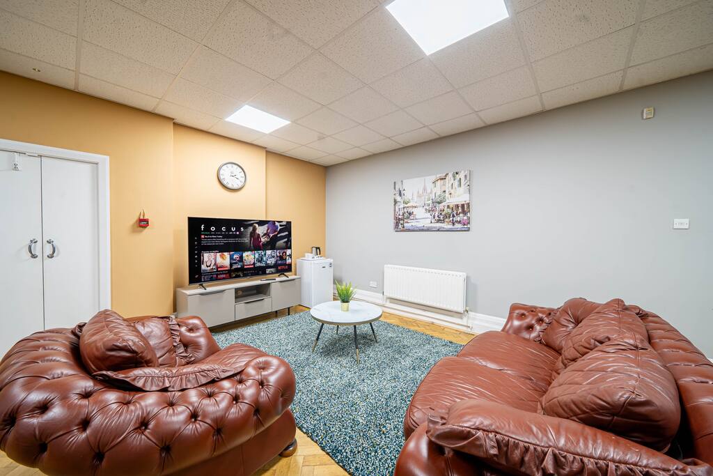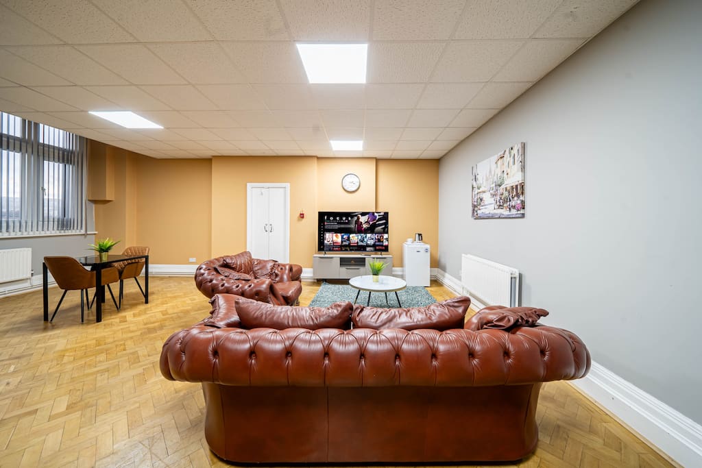 Immerse yourself in huge private bedroom in the historic charm of Bessemer House, featuring a comfy bedroom, expansive living area with a cozy double fold-up bed, and a shared modern bathroom. Indulge in the comfort of leather sofas and a smart TV. Book for a blend of history and comfort. The whole group will enjoy easy access to everything from this centrally located place.