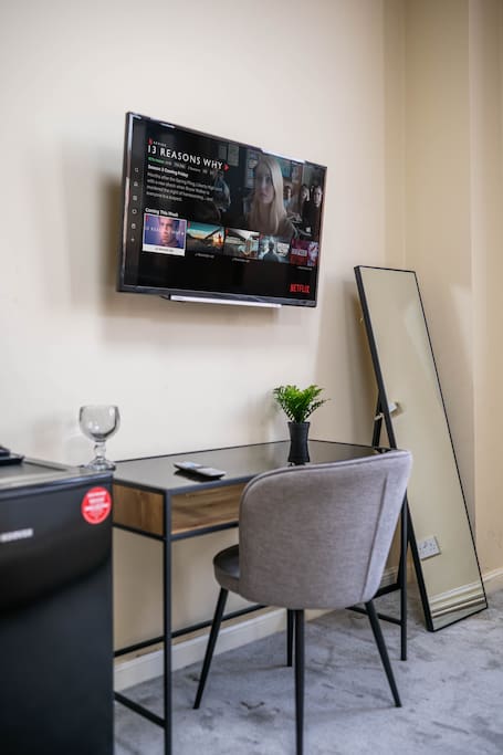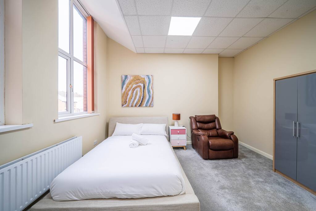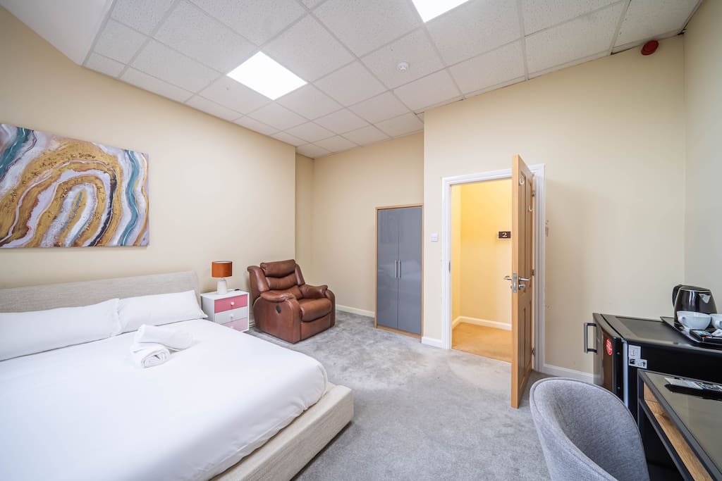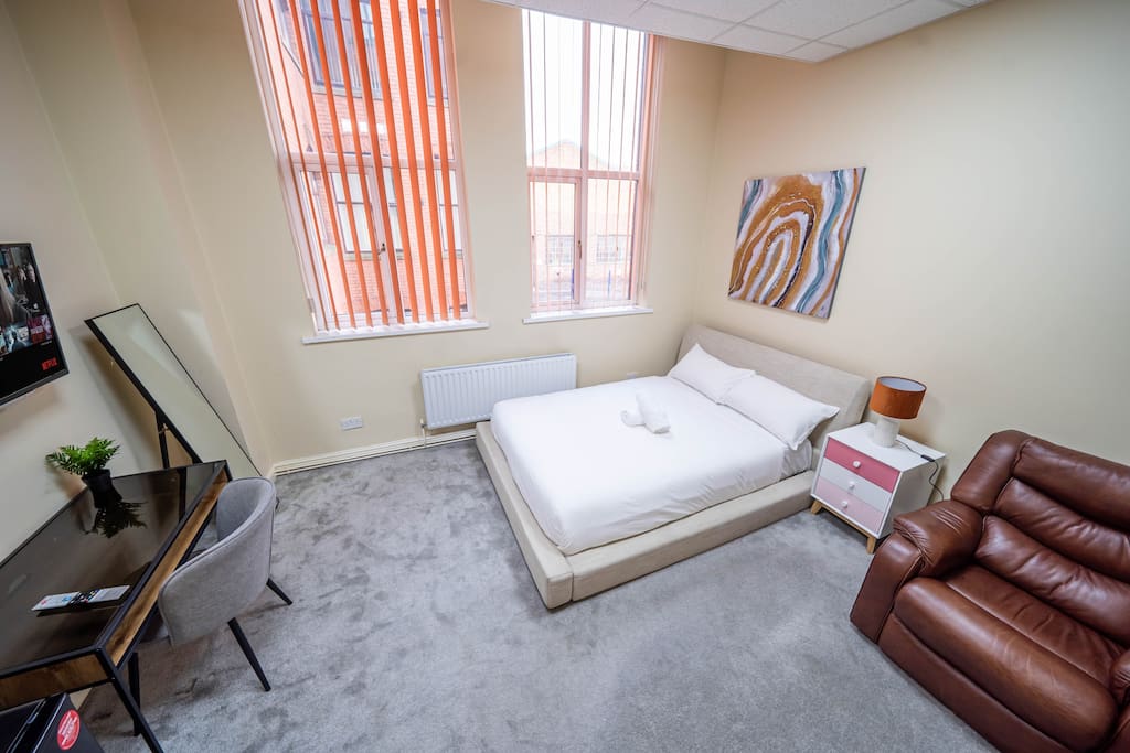 Enjoy a stylish experience at this centrally-located double spacious room in this historic building with character. Room is on the 1st floor of my building. Much larger than standard UK bedroom. Has all basic amenities and more. Designed with traveller on mind. Comfy double bed, Electric armchair and a workstation, lots of natural light and lightning as well. Smart TV for those cosy evenings. Fresh towels and bedding as standard.
