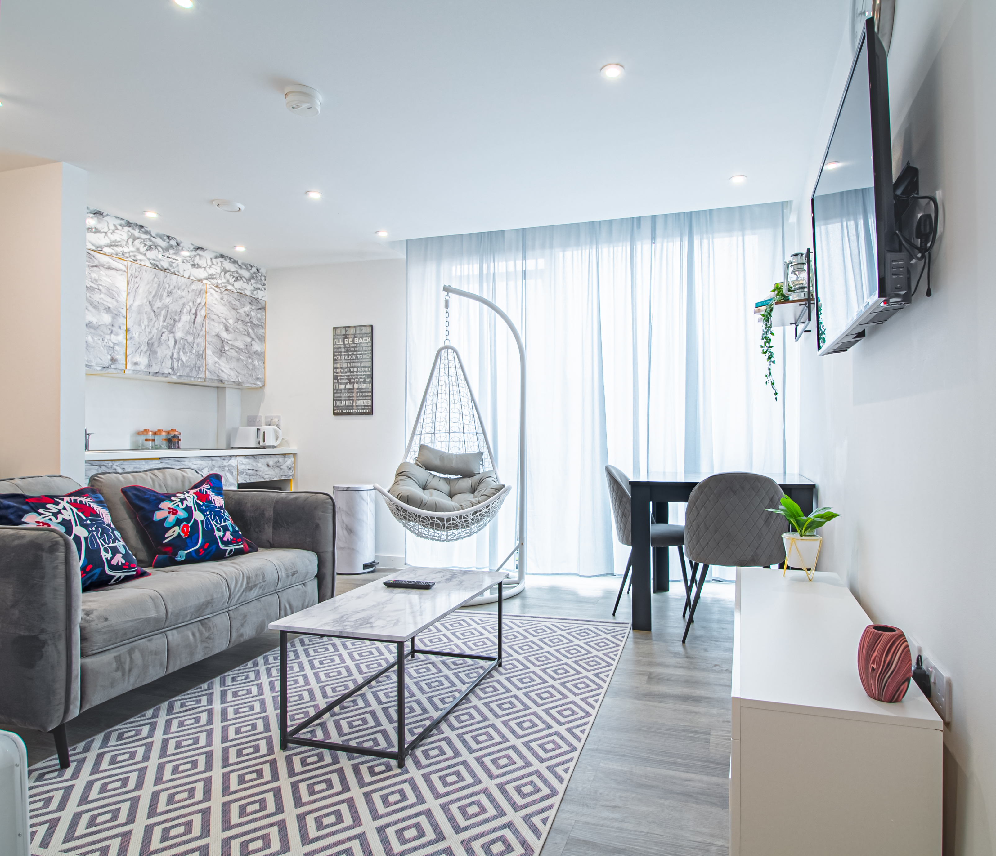 Unwind in this thoughtfully styled Sheffield studio that combines modern elegance with warm, homely touches. This beautifully furnished space features a plush double bed, a Smart TV, and a striking egg swing chair, perfect for reading or relaxing after a day out.